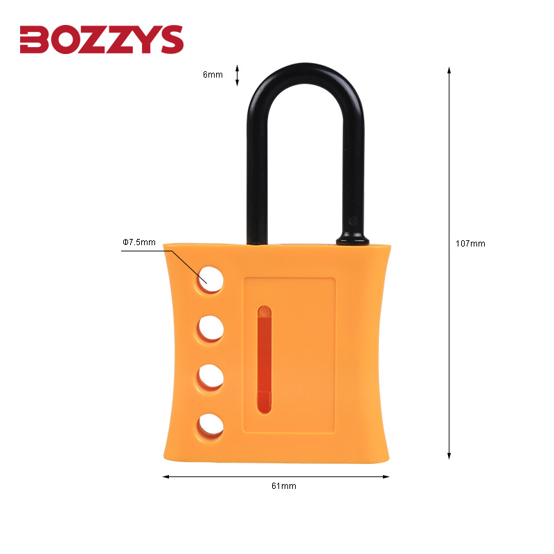 絕緣安全搭扣鎖 尺寸為61 mm x 107 mm,鎖梁直徑徑為6mm,可容納4把安全掛鎖。