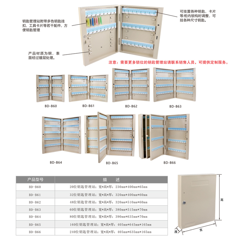 B60 寬×高×厚:230MM×400MM×65MM;設有20位掛鉤,可掛置各種鑰匙、卡片等,柜內鑰匙掛鉤裝置可靈活調整,用來掛各種尺寸鑰匙。
