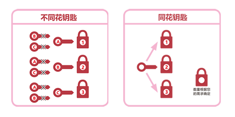 安全掛鎖鑰匙的牙花使用功能及方法KA-同花鑰匙(KA-Keyed Alike):一把鑰匙可以打開同一組里所有安全掛鎖;可以定制多組,組與組之···